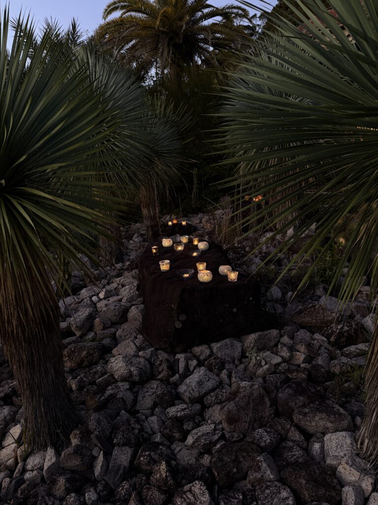 昼は地中海風の明るい庭ですが、夜は一転して異国の小道のような雰囲気になります。